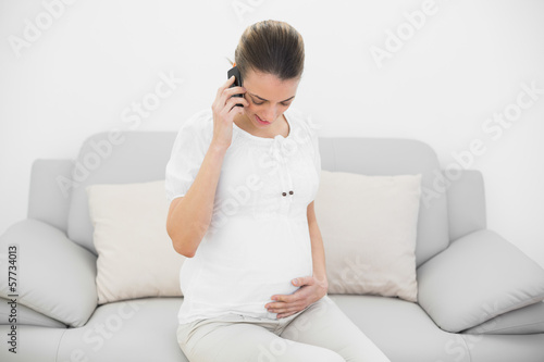 Young pregnant woman phoning while holding her belly and looking