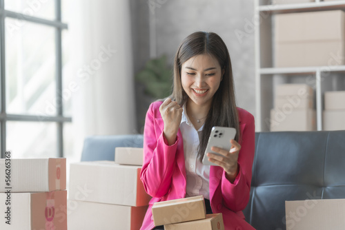 Young pretty asian business woman in suit working with product stock while sitting at sofa, preparing and checking customer address on packaging box.