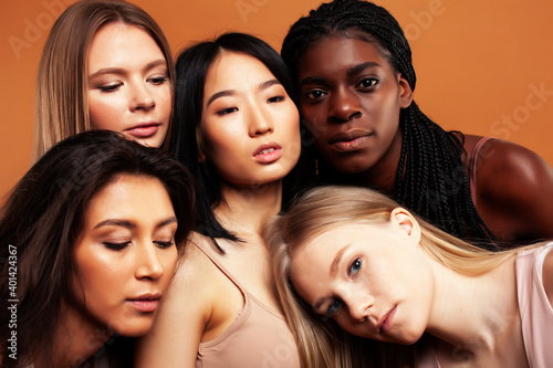 young pretty asian, caucasian, afro woman posing cheerful together on brown background, lifestyle diverse nationality people concept