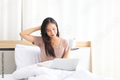 Young pretty Asian girl working from home on her bed using computer laptop to access her work online with copy space