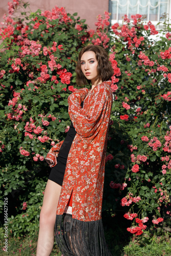 Young pretty female fashion model posing in front of rose bush. Cityscape portrait.