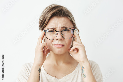 Young pretty girl in glasses thinking frowning looking at camera with fingers on temples over white background.