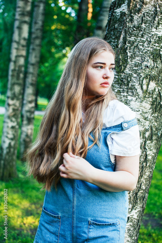 young pretty sensual girl with fashion makeup posing in birch tree forest, lifestyle people concept