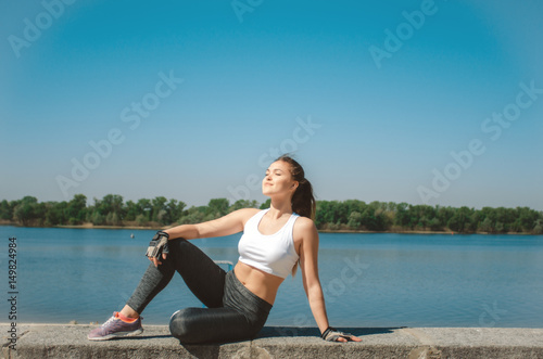 Young pretty slim fitness sporty woman does stretching exercises during training workout outdoor