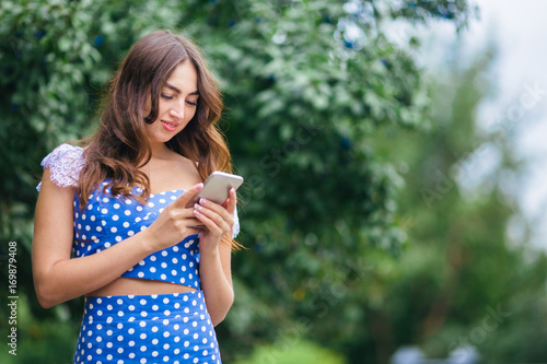 Young pretty stylish smiling woman reading message on smart phone outdoors. Cropped image of young pretty girl walking in the park using mobile phone.
