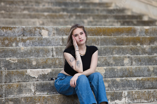 Young, pretty, tattooed blonde woman, wearing jeans, black shirt and sunglasses, sitting on the stairs. The woman is sad and depressed and touches her head with her hand because it hurts.