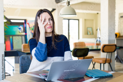 young pretty woman feeling bored, frustrated and sleepy after a tiresome. telecommuting concept