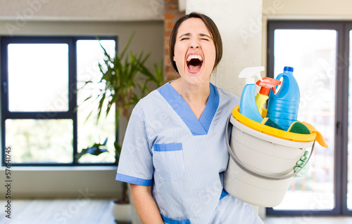 young pretty woman shouting aggressively, looking very angry. housekeeper concept