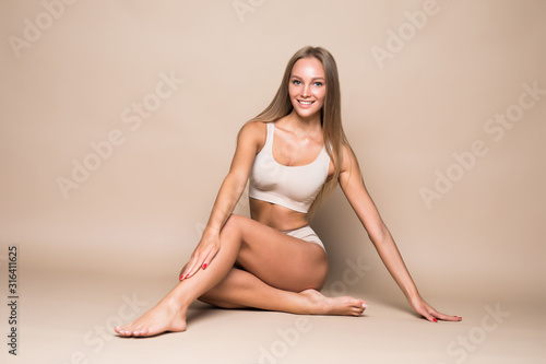 Young pretty woman sitting on the floor in underwear isolated on beige background