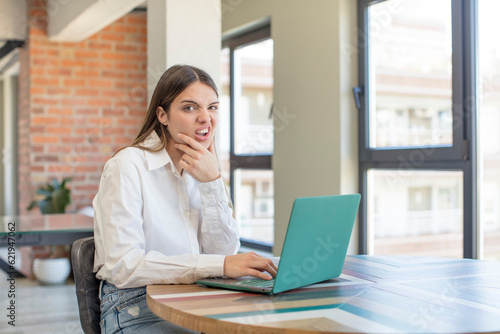 young pretty woman with mouth and eyes wide open and hand on chin. working with a laptop