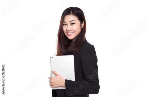 Young professional businesswoman smiling holding digital tablet isolated on white background, Asian woman
