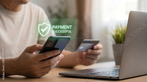 Young professional celebrating successful mobile payment transaction on smartphone with laptop and digital success hologram in modern office