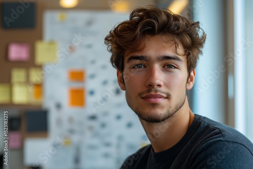 Young Professional Male in Modern Workspace Casual Portrait of Creative Student with Stylish Hairstyle, Engaged in Team Collaboration and Design Thinking
