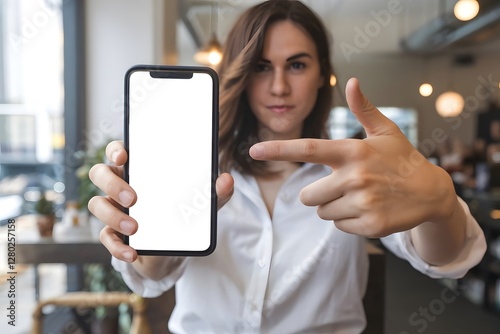 smartphone, mobile phone, blank screen, display, woman, professional, business, cafes, cafes, modern, contemporary, technology, app, advertisement, presentation, pointing, hand, finger, digital, businesswoman, portrait, closeup, caucasian, female, white shirt, black phone, vertical, marketing, advertising, businesswoman, daylight, mobile, phone, holding, looking, showing, screen, person