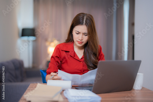 Young professional woman feeling stressed and frustrated while working on a laptop and reviewing documents, struggling with accounting and financial issues at home