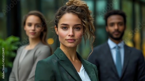 business, professional, corporate, leadership, executive, workplace, office, diversity, team, success, confidence, career, businesswoman, blazer, suit, green jacket, glass building, corporate culture, business attire, corporate environment, business building, business district, teamwork, collaboration, management, female executive, businessperson, professional woman, career woman, business meeting