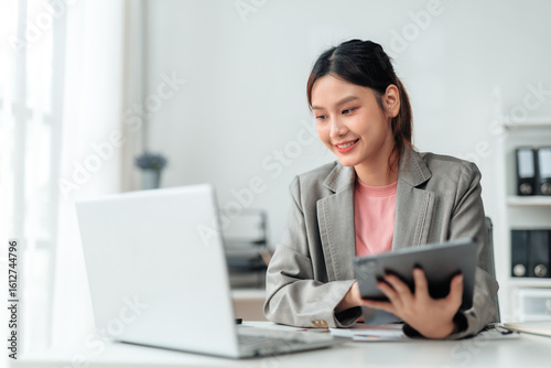 business, woman, office, laptop, tablet, computer, working, technology, businesswoman, professional, work, desk, digital, cyberspace, online, communication, connection, device, screen, corporate, job, career, project, datum, information, analysis, strategy, planning, finance, marketing, sale, success, achievement, growth, development, modern, workspace, interior, window, light, bright, happy, smiling, female, young, adult, asian, asia