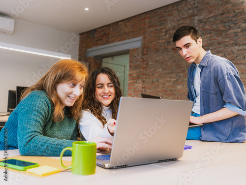 Young professionals working together in a coworking space, smiling and brainstorming ideas while using laptops in a collaborative environment