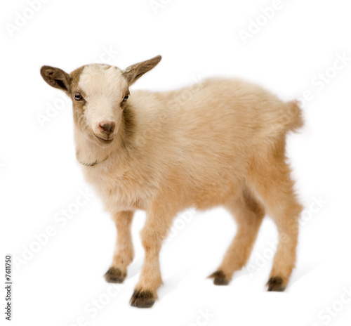 animal, children, cream, cut-out, domestic, farm, farm animal, goat, horned, isolated, isolated on white, farm animal, profile, pygmy, half face, standing, white, white background, yellow, young