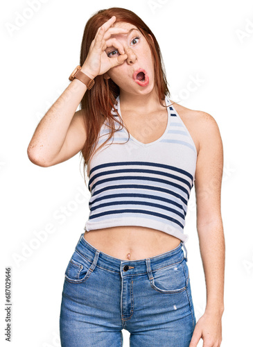 Young read head woman wearing casual clothes doing ok gesture shocked with surprised face, eye looking through fingers. unbelieving expression.