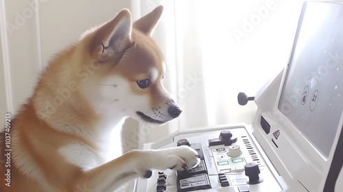 Paws in Space: Close-up of the Shiba Inu’s paw pressing buttons on a makeshift control panel. The buttons are labeled with dog-friendly symbols.