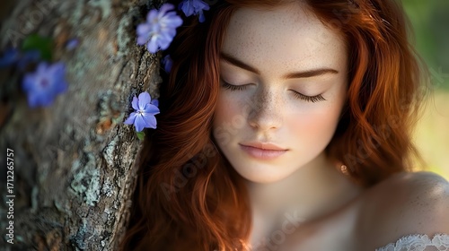 Young redhead woman with closed eyes and natural makeup near tree trunk with blue flowers, soft dreamy portrait in nature with blurred background.