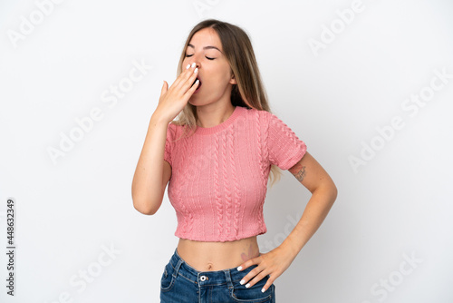 Young Romanian woman isolated on white background yawning and covering wide open mouth with hand
