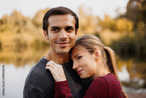 couple, autumn, lake, sweater, nature, together, human relationships, boyfriend, girlfriend, mixed race, caucasian, relaxation, bonding, lifestyle, pullover, warm, cosy, romance, beautiful, holiday, date, vacation, weekend, leisure, young adult, people, coast, hug, hugs, beauty, water, smile, happy, happiness, positive