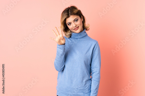 Young Russian woman isolated on pink background happy and counting four with fingers