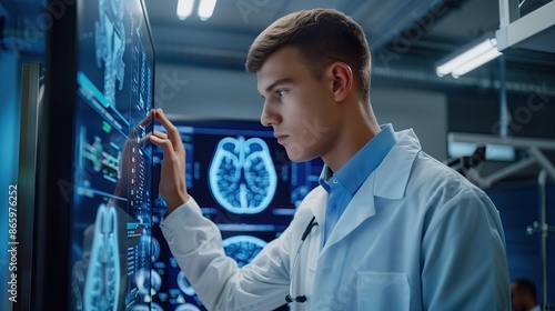 Young scientist examining and analyzing data on the screen of AI technology.