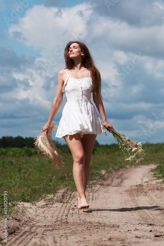 woman, sexy, beauty, summer, walk, road, rural, cloudy, field, clear, hair, smile, brunette, sky, holiday maker, traveler, travel, harmony, hat, straw, happiness, go, trip, wildflower, journey, adventure, wind, alone, free, leisure, calm, way, happy, away, vacation, countryside, fun, nature, fashion, against, relaxation, silence, lifestyle, freedom, young, beautiful, dress, outdoors
