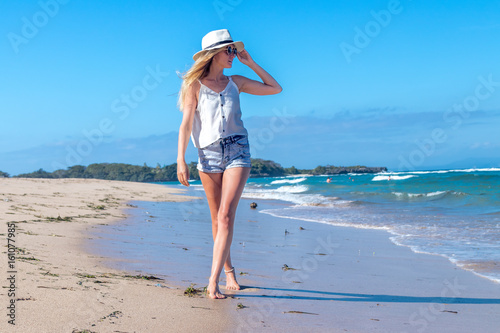 Young sexy woman with white hat walking on white sand beach a tropical Bali island at sunny day. Ocean cost.
