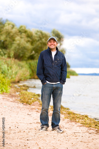 man, young, smile, jean, coast, river, look, autumn, against, tree, sea, happiness, happy, ocean, beach, shoe, footwear, clothes, sexy, fun, male, sky, portrait, beautiful, blue, cloud, nature, park, people, person, romantic, adult, background, white