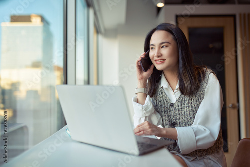 Young smiling Asian business woman client manager working in modern office making phone call. Happy female professional worker talking on mobile cellphone using laptop working at desk.