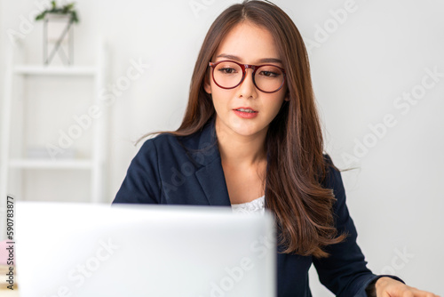Young smiling asian woman relax using laptop conference work,learning education,study online,webinar podcast,creative woman looking typing message with on keyboard at home
