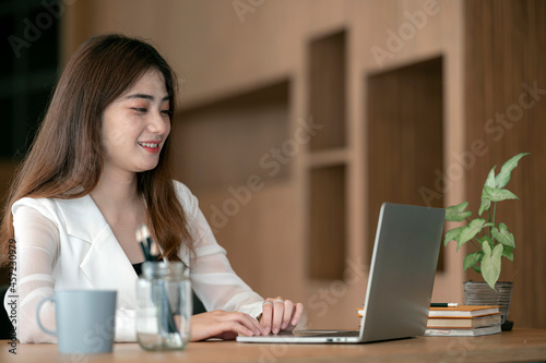 Young smiling asian woman working on laptop computer while sitting at the table in modern office room,