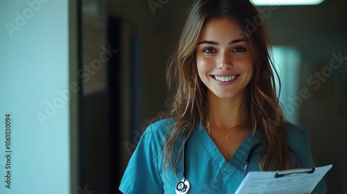 doctor, woman, female, health care, medicals, hospital, clinic, health, professional, nurse, medicine, care, patient, treatment, wellness, happy, smile, confident, cheerful, beautiful, portrait, young, adult, indoor, stethoscope, scrub, uniform, clipboard, corridor, hallway, practitioner, physician, surgery, recovery, emergency, surgeon, profession