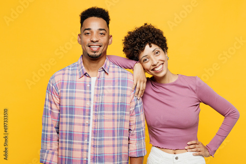 Young smiling happy couple two friends family man woman of African American ethnicity wear purple casual clothes together wife put head on shoulder isolated on plain yellow orange background studio.