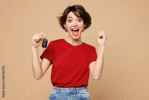Young smiling happy woman wear red t-shirt casual clothes hold in hand car key fob keyless system do winner gesture isolated on plain pastel light beige background studio portrait. Lifestyle concept.