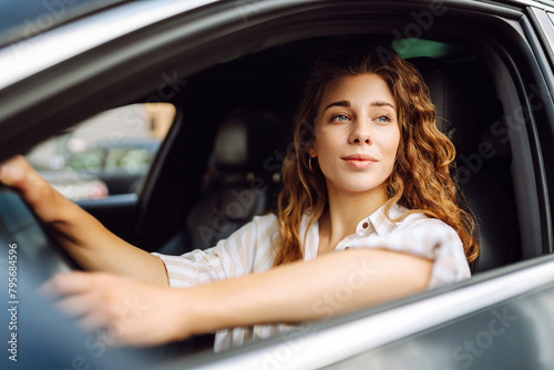 Young smiling woman driving a car drives around the city. Car travel, lifestyle, carshering concept.