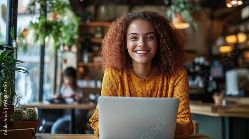 Young smiling woman sits at table with laptop in busy coffee shop