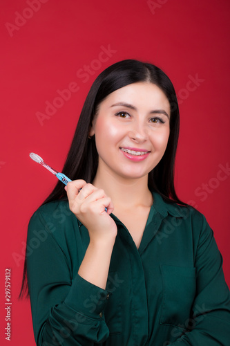 Young smiling woman with a toothbrush in hand, posing in studio on a red background