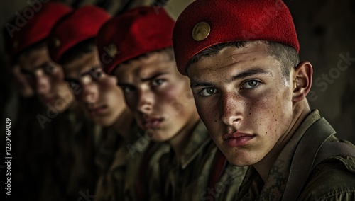 soldier, military, portrait, red, army, young, man, determination, sharpened, serious, intense, uniform, camouflage, group, line, face, expression, gaze, eye, headwear, headgear, dark, shadow, closeup, photo, image, photo, picture, troop, warrior, combat, defense, patriotism, brave, duty, discipline, strength