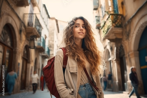 Young Solo Girl Traveler Exploring the Streets of Old Town in Spain. Backpacker Tourist Enjoying a Vacation in a Charming European City.