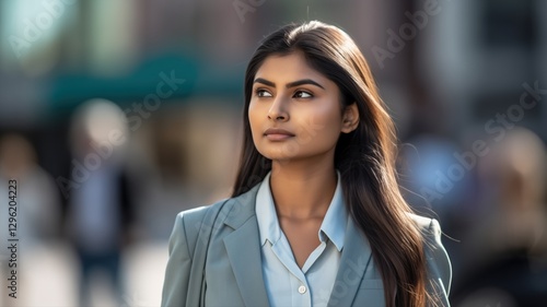 young South Asian women professional walking down a busy urban street