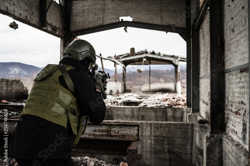 Young Special forces SWAT soldier aiming with assault rifle gun at the ruined building war terrorist battle zone airsoft