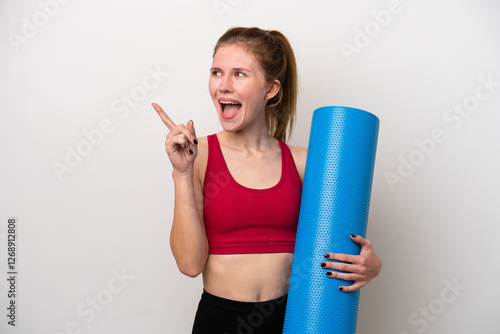 Young sport English woman going to yoga classes while holding a mat isolated on white background intending to realizes the solution while lifting a finger up