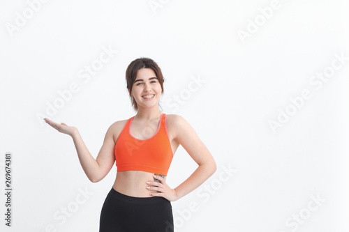 Young sport model on a white background with open hand palm to hold product