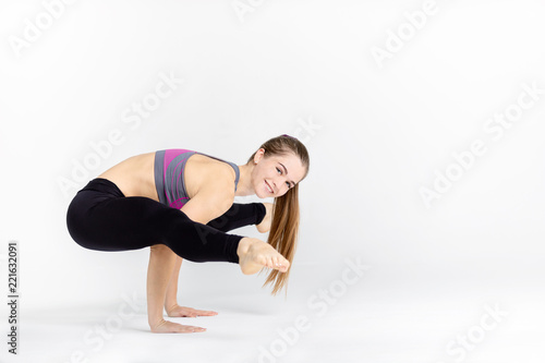 woman, stretch, smile, training, back, bending, handstand, physical exercise, girl, sport, fitness, person, dance, yoga, exercise, sporty, aerobic, athletic, beautiful, caucasian, female, gym, isolated, young, white, adult, body, fit, flexibility, flexible, gymnastics, health, healthy, lifestyle, slim, athlete, attractive, bra, practice, pretty, recreation, shape, sitting, warmup, full-length