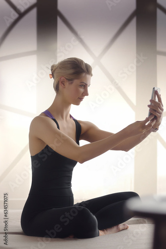activity, aerobic, alone, athlete, beautiful, beauty, body, blond, care, exercise, female, figure, fit, fitness, contraption, girl, gymnastics, happiness, healthy, holding, indoor, lifestyle, light, mobile, modern, person, photo, photographing, phone, physical, pilates, practice, relax, selfie, slim, smartphone, smile, sport, activewear, sportswoman, sporty, stretching, studio, technology, training, wellness, woman, physical exercise, yoga, young